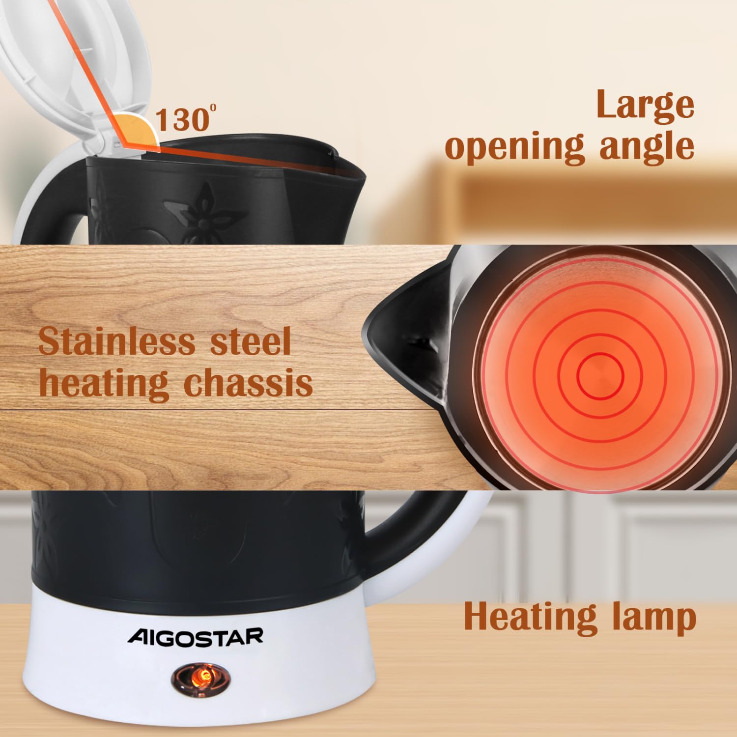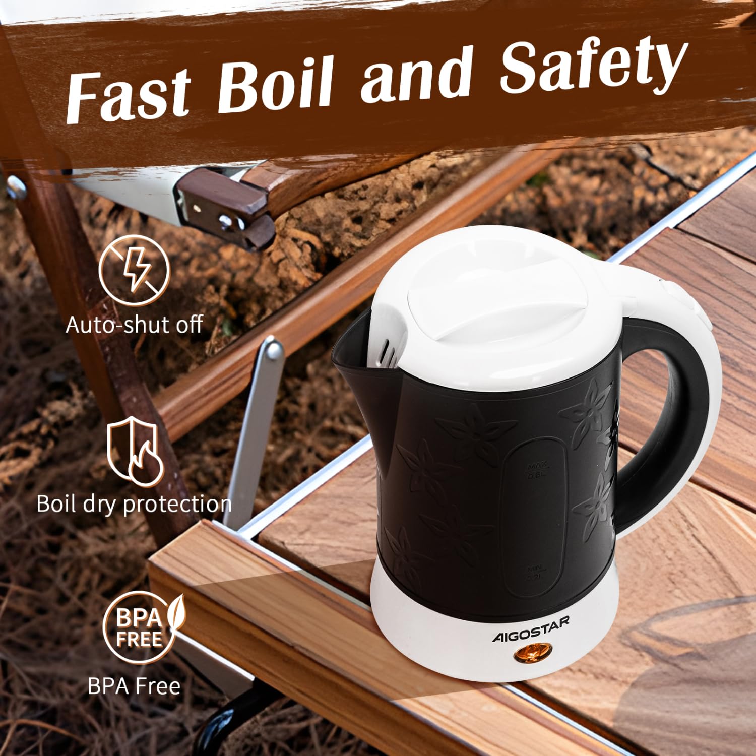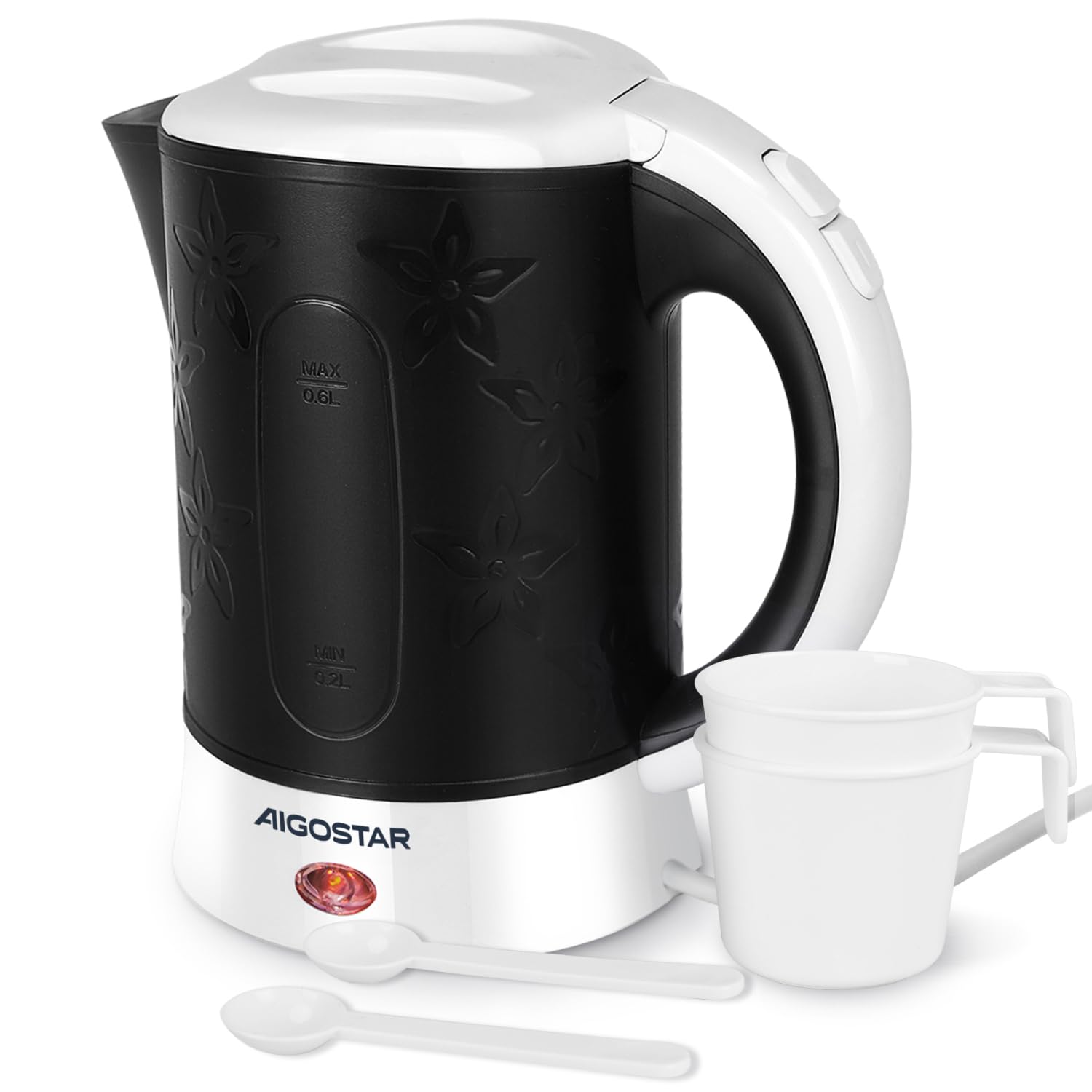 Aigostar Cooltravel - Mini Wasserkocher Klein 0,6 Liter Reisewasserkocher 650W, Camping Kleiner Wasserkocher Inklusive 2 Tassen und 2 Teelöffel, Abschaltautomatik mit Trockenschutz, Shwarz.