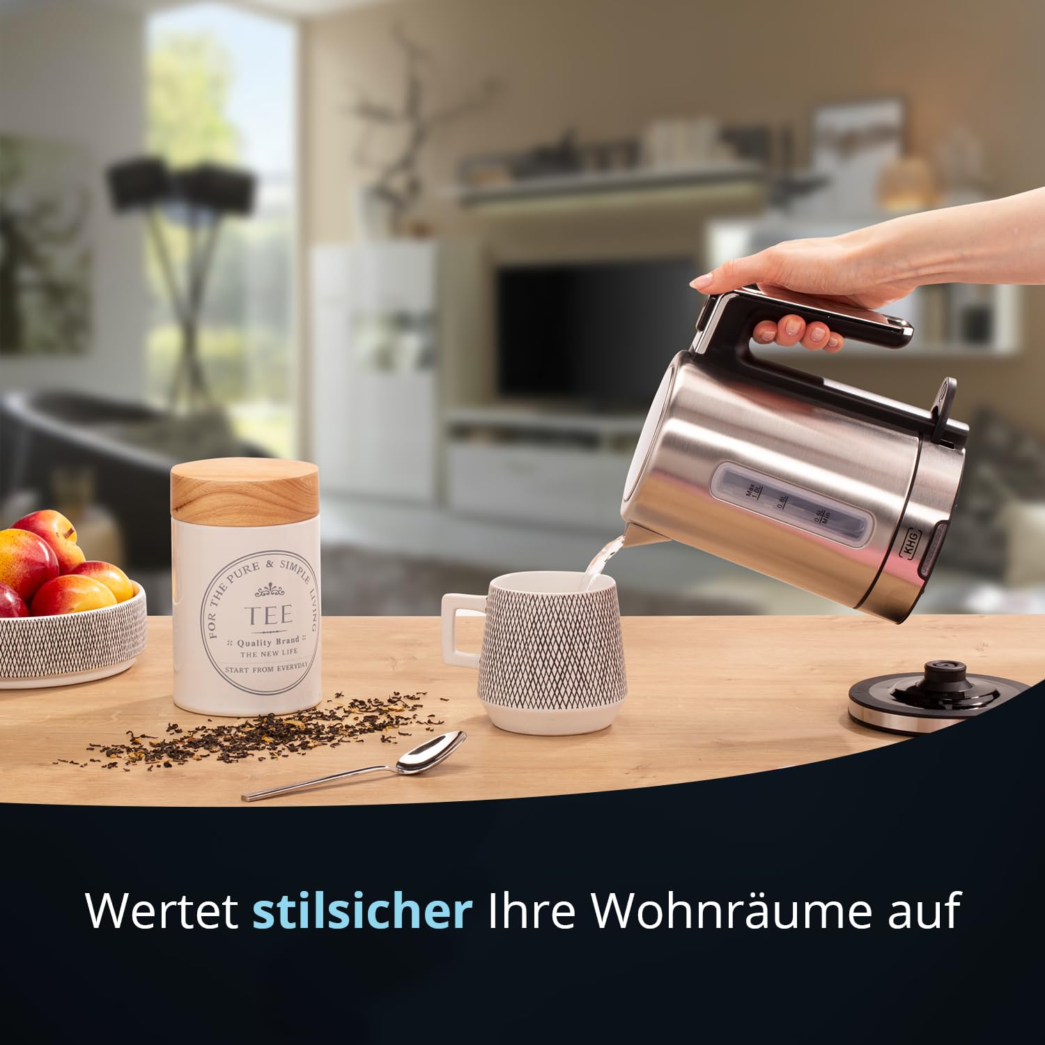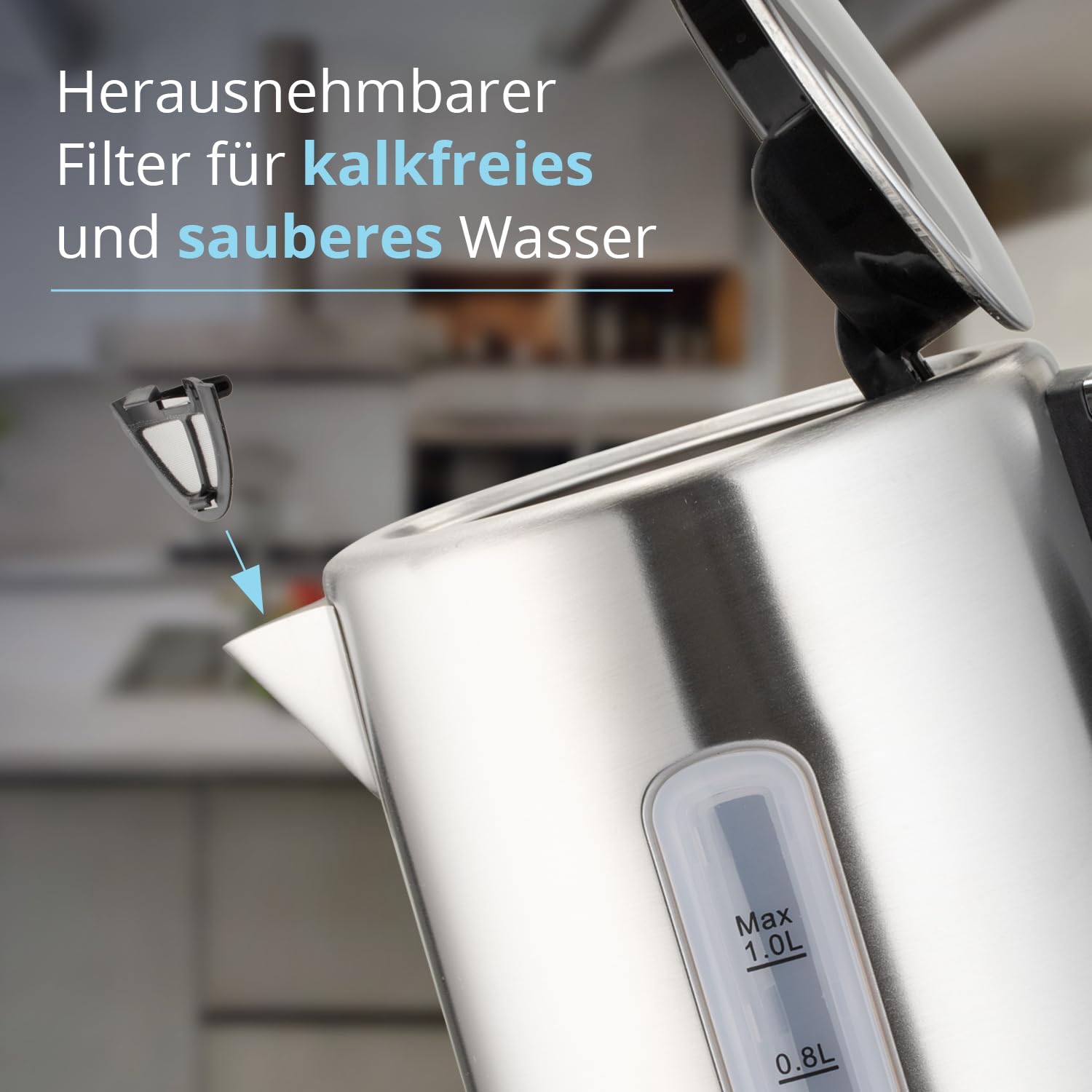 KHG Wasserkocher WK-105 ES Edelstahl, 1 Liter, abwaschbarer Kalkfilter, Wasserstandsanzeige, Öffnen per Knopfdruck, Trockengehschutz & Abschaltautomatik, verdecktes Heizelement, BPA-frei, 2200 Watt