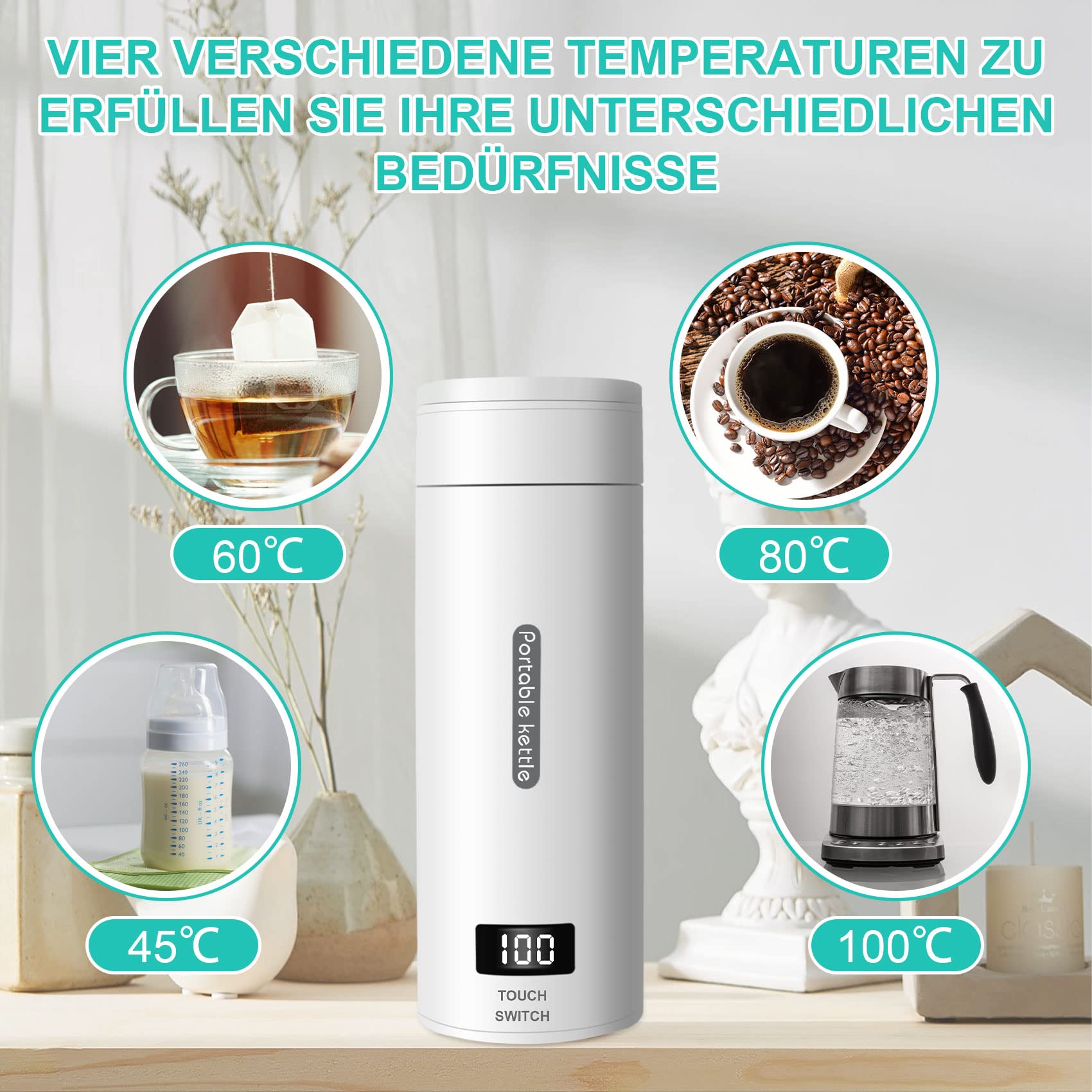 • 🥤【Vierstufige Temperaturregelung】Die vierstufige Temperatureinstellung beträgt 45 °C bis 60 °C bis 80 °C bis 100 °C. LCD-Echtzeit-Digitalanzeige Temperatur, Ein-Tasten-Schalter. Kochwasserregelung und thermostatische Temperaturregelung müssen angeschlossen werden. Die Zeit vergeht, die Temperatur bleibt gleich.
